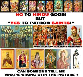 CAN YOU TELL US WHAT’S WRONG WITH THE PICTURE HERE? WHY THIS DOUBLE STANDARD IN CHRISTIANITY THAT SHUNS AND MOCKS HINDUISM AS DEVIL WORSHIP BECAUSE OF ITS POLYTHEISM ? Isn’t God supposed to be omnipotent enough to KNOW everything rather than have dead minions that we need to go through instead?? Thought the direct line was through his son!