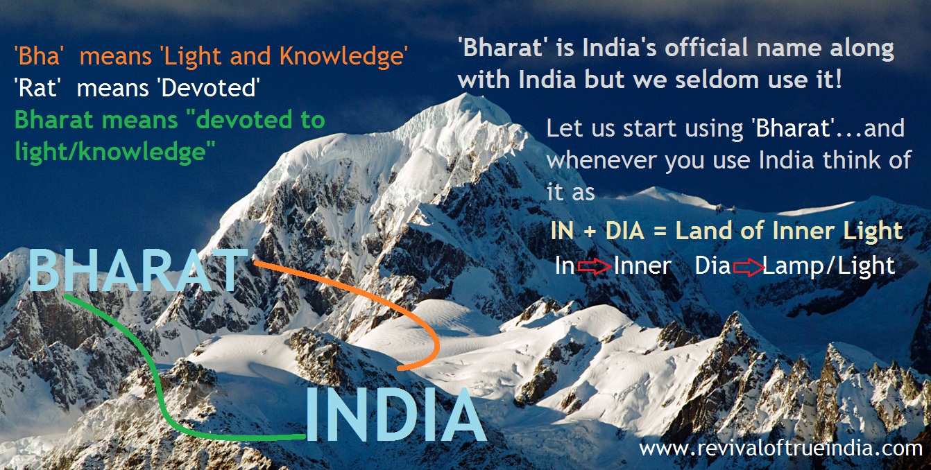 Through the ages our ancestors referred this land as Bharat. Though the name ‘Bharat’ should be used, we seldom use it today! Why not refer India asIn + Dia = India ==> The Land of Inner Light analogous to its original name Bha + rata = Bharat ==> meaning devoted to light and knowledge ?
