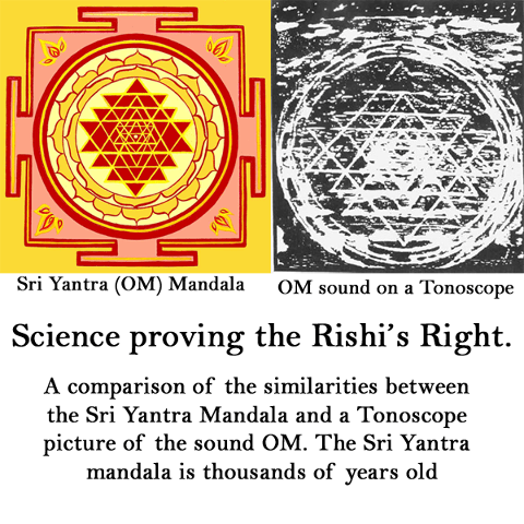 The Sri-Yantra Mandala is the image of the OM mantra, the primordial Hindu sound of creation . When OM is intoned into a tonoscope, it first produces a circle. As the tone is completed, the circle is filled sequentially with concentric squares, triangles and finally, as the “mmm” dies away, the Sri Yantra.
