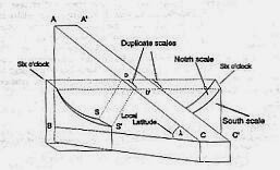 The instrument consists of a meridian wall ABC, in the shape of a right triangle, with its hypotenuse or the gnomon CA pointing toward the north celestial pole and its base BC horizontal along a north-south line. The angle ACB between the hypotenuse and the base equals the latitude lambda of the place. Projecting upward from a point S near the base of the triangle, are two quadrants SQ1 and SQ2 of radius DS. These quadrants are in a plane parallel to the equatorial plane. The center of the two ‘quadrant arcs’ lies at point D on the hyptenuse. The length and radius of the quadrants are such that, if put together, they would form a semicircle in the plane of the equator.