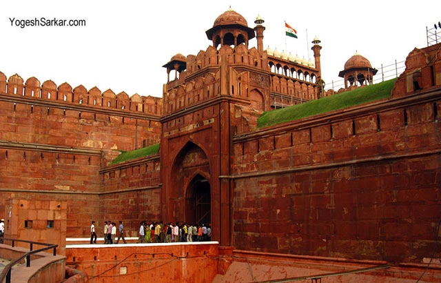 PICTURE ABOVE- shows the entrance of the Moti Masjid inside the Red Fort. The archaeological tablet, raised outside, claims that the mosque was built by Aurangzeb, son and successor of Shah Jahan. But many believe that the claim is baseless due to the following reasons. Firstly, the entrance is of a temple design. Secondly, the arch between the domes there are stone carvings of banana bunches, which is used by the Hindus while worshipping their deities. Thirdly, the naming buildings after gems (Moti means pearl) is purely a Hindu custom. Fourthly, the truncated Hindu perambulatory passage may still be seen to exist on the building’s left flank. All these evidence suggest that, originally it was a Hindu temple and, later on, converted into a mosque by the Muslim invaders.