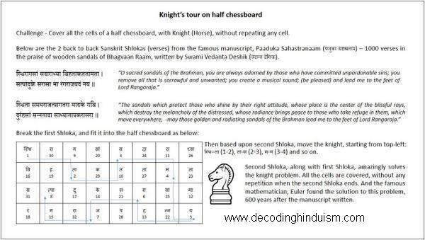 One of the first mathematicians to investigate the knight’s tour was Leonhard Euler. The first procedure for completing the Knight’s Tour was Warnsdorff’s rule, first described in 1823 by H. C. von Warnsdorff. But Indians solved 600 years before Euler.