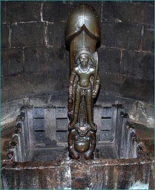 The linga on its frontal faceta relief figure standing siva. He has two hands the right one holds a ram by the hind legs head hanging downwards. In the left a globular pot is held and a battle axe(parasu) rests on the left shoulder. The linga is fixed within two stone rings during the earliest phase inside the sanctum which served as arghapitha. The standing form of the god reveals Vedic and protopuranic concepts of Rudra. He is shown standing on the shoulders of a crouching dwarf Yaksha whose features are unique. He is seated on the knees body shrunken, and light teethed as if resisting the super lord. The ears are leaf shaped while the terminals of feet show their merman affinity this save dika linga set up was apparently in open during the early centuries B.C. and surrounded by allow three bared on slabs ecalling of baruhut and bodhgaya. The tops of the railing were found broken,but now renovated to its original height and matching color expect the main linga and the pithas surrounding by a stone railing all the other structural embellishments are later additions by successive rulers and the temple continued to be venerated from circa third century B.C. down to the present day.