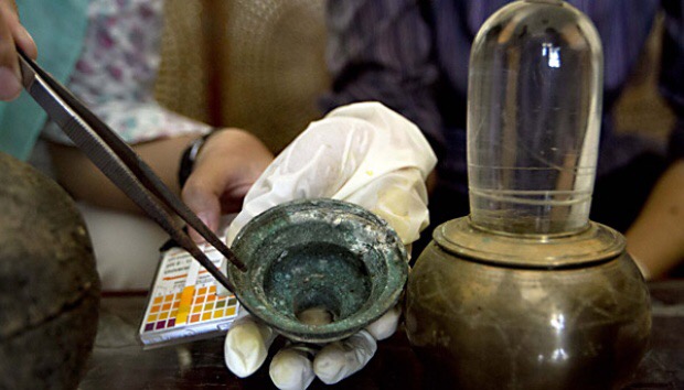 The water in the cup was not dry despite it being centuries old. Here a test to see whether the water is acidic is being conducted. Tempo.co