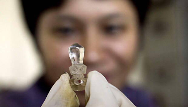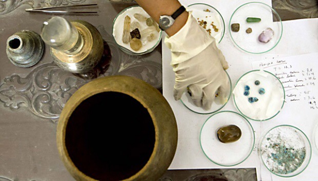 An archaeologist measuring the diameter of the cup in which the Crystal Shiva Lingam is encased. Tempo.co