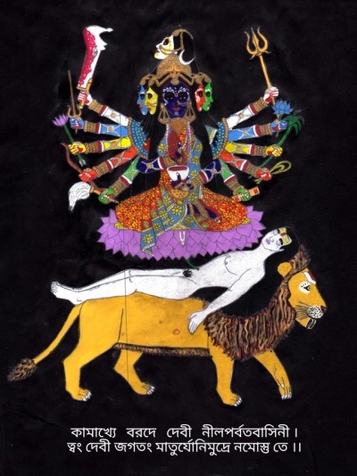 The first temple on the site of Yonipīțha was built by the divine architect Viśvakarmā. When Kāmadeva was reduced to ashes by the flame of Lord Śiva’s third eye, his wife Ratī came here and propitiated Devī Siddha Kubjikā for ressurection of her husband. When brought back to life, Kāma duly worshiped Pīțhaśakti of Yonipīțha, who then became renowned by the name “Kāmākhyā” while the region came to be known as “Kāmarūpa” country. The current temple was constructed by King Viśva Sińģha of Koch Behar (West Bengal).