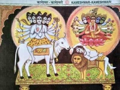 Here Devī is venerated in five-fold forms of Kāmākhyā, Kāmeśvarī, Tripurā, Sāradā & Mahotsahā; along with eight Yoginīs known as Koțeśvarī, Guptakāśī, Śrīkāmā, Vindhyavāsinī, Pādadurgā, Dīrgheśvarī, Dhanasthā & Prajațā.
