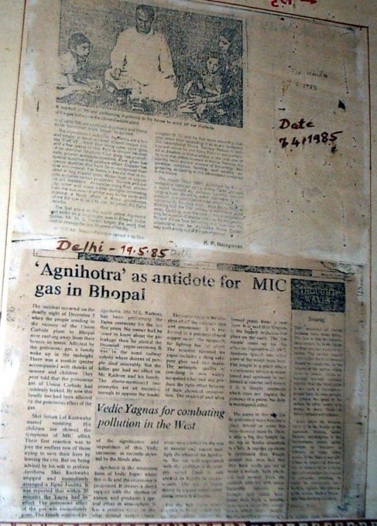 At the time of the Bhopal Gas Tragedy most of the Indian newspapers highlighted the wonderful curative effects of Agnihotra. A news report excerpt from