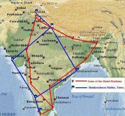 It was this idea of civilizational unity and sacred geography of India that inspired Shankaracharya to not only enunciate the mysteries of the Vedanta but to go around setting up mathas circumscribing the land of India in a large diamond shape. While sage Agasthya crossed the Vindhya and came down south, Shankracharya was born in the village of Kalady in Kerala and traveled in the opposite direction for the establishment of dharma. If this land was not linked in philosophical and cultural exchanges, and there was no notion of a unified nation, why then did Shankracharya embark on his countrywide digvijay yatra? What prompted him to establish centers spreading light for the four quadrants of this land – Dwarka in the west (in Gujarat), Puri in the east (in Orissa), Shringeri in the south (Karnataka) and Badrinath (Uttaranchal) in the north? He is then said to have gone to Srinagar (the abode of `Sri’ or the Shakti) in Kashmir, which still celebrates this in the name of Shankaracharya Hill. What better demonstration that the idea of the cultural unity of the land was alive more than a thousand years ago?