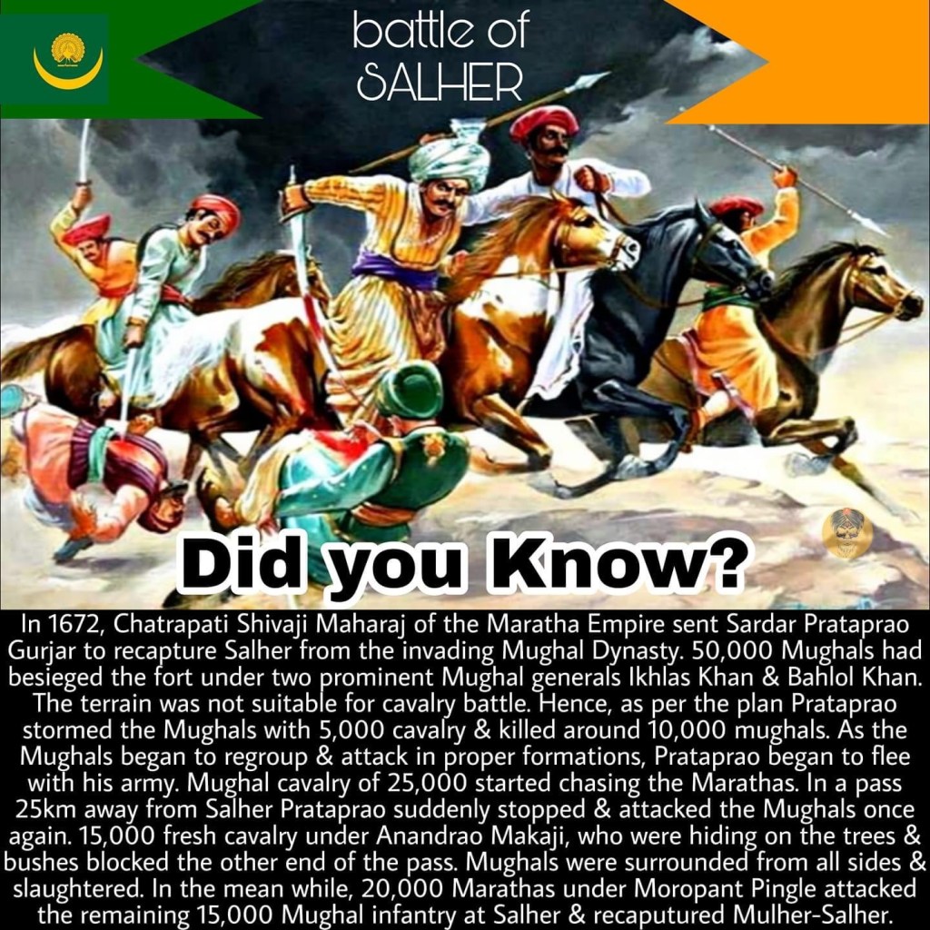 Shivaji Maharaj ordered Moropant who was in South Konkan and Prataprao who was raiding near Aurangabad to meet and attack Mughals at Salher to relieve the fort. In his letter to his commanders Shivaji had written ‘Go to the north and attack Salher and defeat the enemy’. Both the Maratha forces met near the village of Vani, they bypassed the Mughal camp at Nashik and reached near Salher. The terrain was not suitable for cavalry battle hence the Maratha commanders decided to lure, split and finish the Mughal forces at different places. As per the plan Prataprao Gujar stormed the Mughals with 5,000 cavalry and killed many unprepared soldiers. After half an hour the Mughals became fully ready and Prataprao started to flee with his army. The entire Mughal cavalry of 25,000 started chasing the Marathas. Prataprao lured mughal cavalry in a pass 25 km away from Salher where the 15,000 cavalry under Anandrao Makaji was hiding. Prataprao turned his back in the pass and attacked the Mughals once again. The 15,000 fresh cavalry under Anandrao blocked the other end of the pass. Mughals were surrounded from all sides & slaughtered.